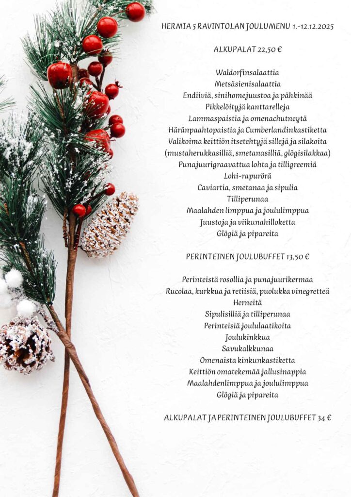 Tervetuloa nauttimaan herkullisista Joululounaista lämpimässä ravintolamiljöössä Hermia 5:ssa.